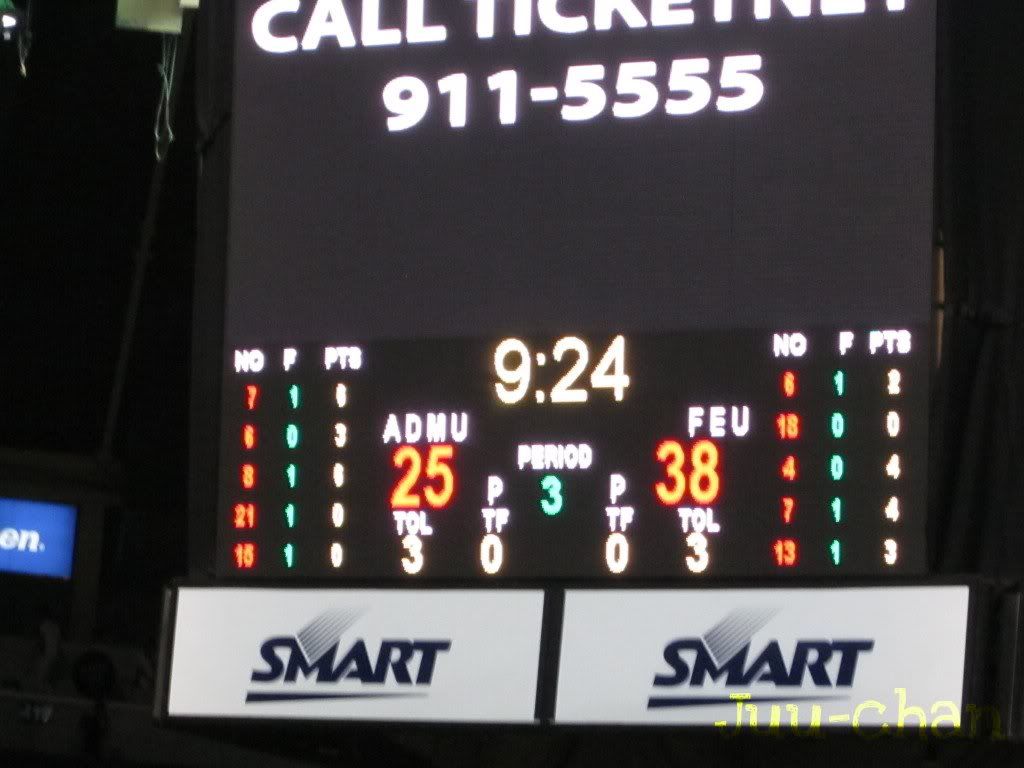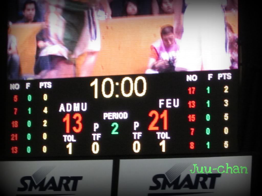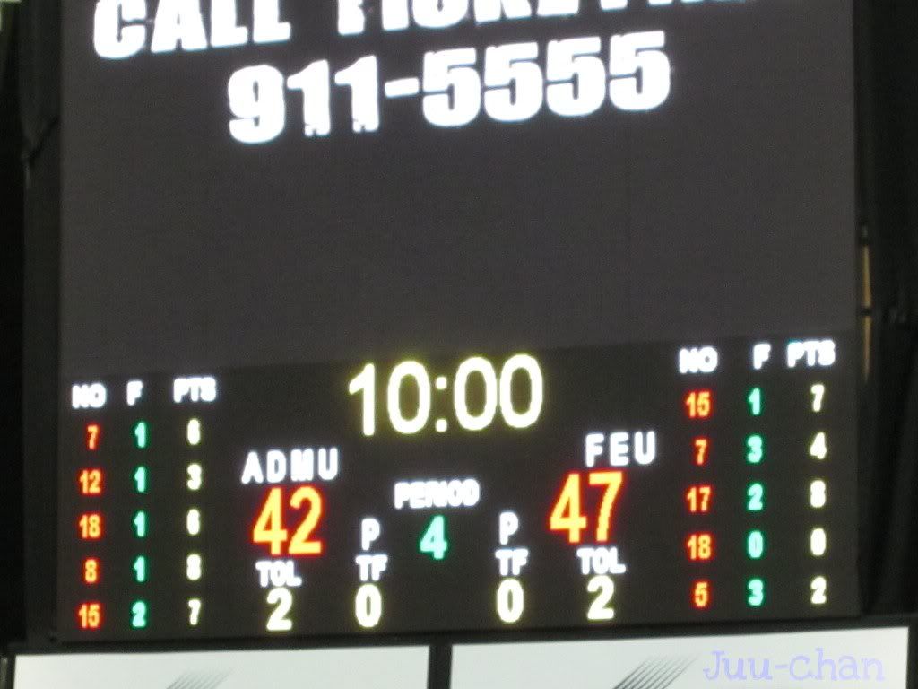 i love it! i can see them. there are few people because it is the first game. FEU vs ADMU is the second game. i took that picture while waiting for the game to start. the jumpshot (wait am i right? this is the first part of a basketball game,jumpshot right? not sure.) 1st Quarter scores [wooh!! GO FEU!!] So we lost. But there is still hope!FEU will still compete with other schools.GO FEU!!!oh by the way, I SAW MY SUPER DUPER BASKETBALL PLAYER CRUSHES ON THE COURT!! HOOORAY!!!this is the first time that i watched them play live xD