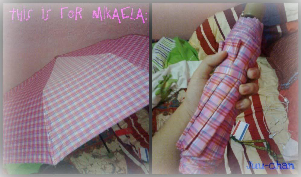 i really like Mikaela so much..but she lives faaaaar away from me..but still, we are still bestfriends. she thinks of me as her "ate". very sweet,right? so i want to make her happy always. so i take pictures of the things she might like. remember the doll and the shades, that's for her! there is another one! when i asked her on the text, "pink is your favorite color, right?"..she said "yes" and she added that she also likes blue but PINK really is her favorite. and then i said, "ok! i'll buy a pink umbrella then." hahaha! she was surprised. [coz i can't decide what umbrella should i buy :D ]