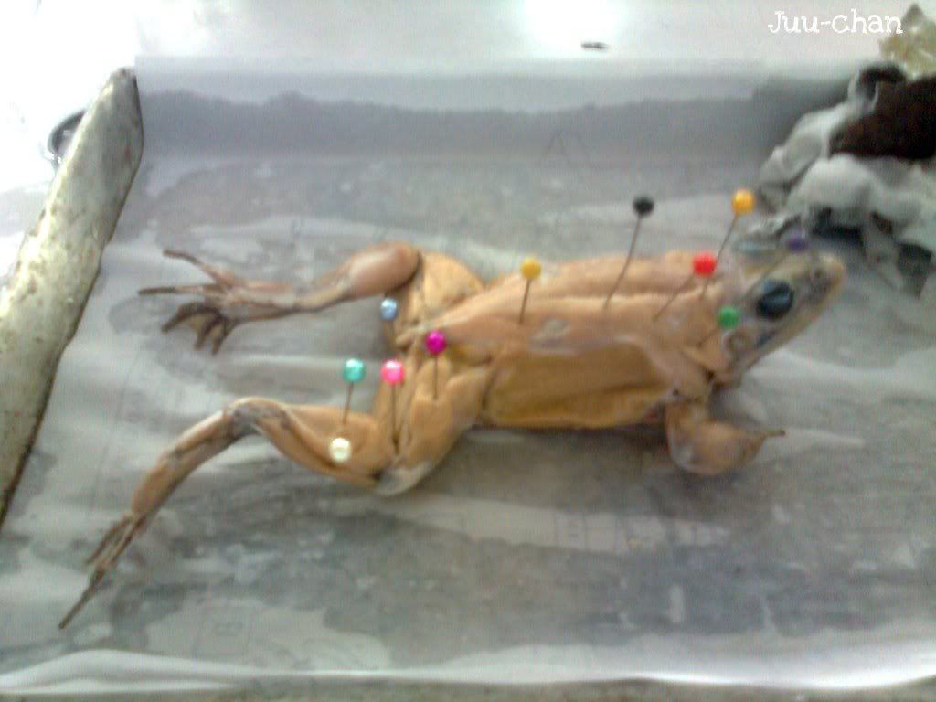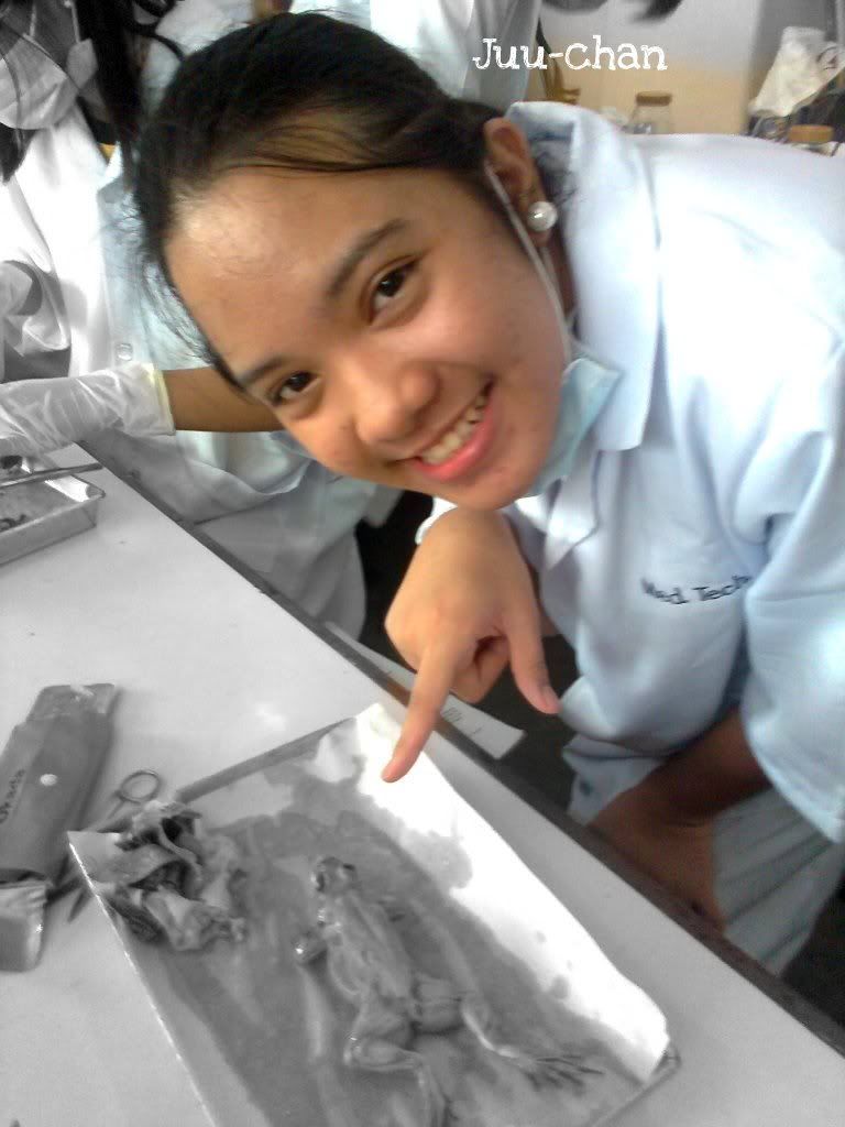 and when the time has arrived for dissecting, i was kinda nervous and anxious.hahaha! each of us received a frog. honestly, I CRIED! that's true. you wanna know why?! no, it's not because i saw the frogs and tell myself that's it's super yucky. yes, it looks yucky but it's really fine with me. i cried because of the chemical used to preserve the dead frogs. it is called Formalin. THANKS FORMALIN, I CRIED BECAUSE OF YOU! XD my goodness! it really has a strong smell! when you smelled a lot of formalin,or even a bit, it hurts your eyes until you cried and got teary eyes. hehehe..we peeled off the skin of the frog and identify the name of each part of the frog's muscles using some colored pins.