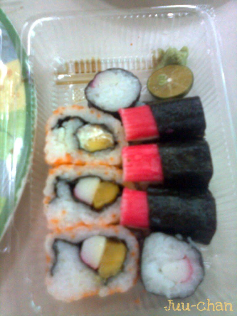 well, i just saw this in our university canteen. and i promise i will not eat rice, barbecue, and sushi all together. sushi alone can make me full. i am so stupid, hahaha!