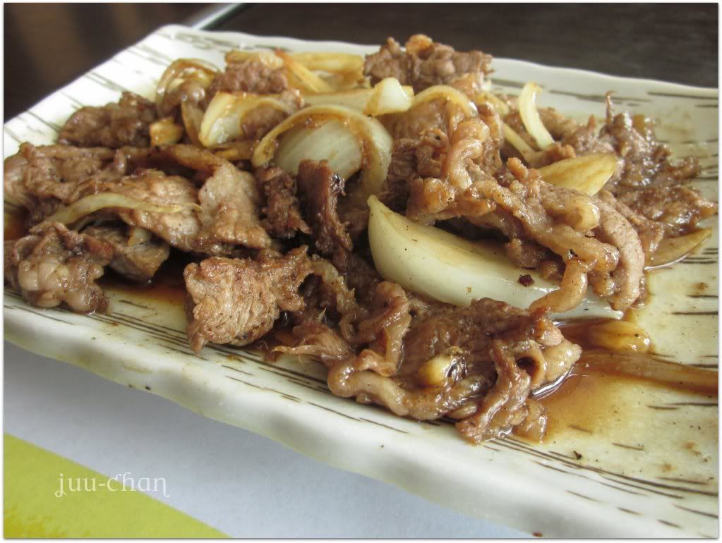 Sukiyaki Beek Teppanyaki (Beef bacon slices stri-fried with teppanyaki sauce and onion slices) |